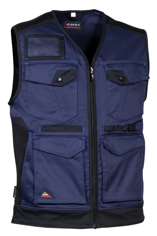 DESCRIZIONE: 2 tasche anteriori con velcro, 2 tasche anteriori con zip, ampia tasca interna, apertura centrale con zip, fettuccia porta attrezzi, inserti in tessuto traforato nella zona laterale-spalla per una migliore traspirabilità, interno con fodera in rete, tasca petto portacellulare con tessuto E-WARD chiusa con snap, tasca porta badge, tasca sul petto con pattina chiusa con snap, taschino anteriore, tessuto ad elevata percezione elastica